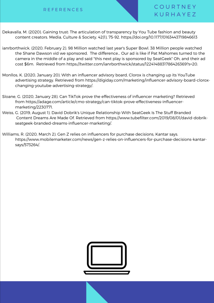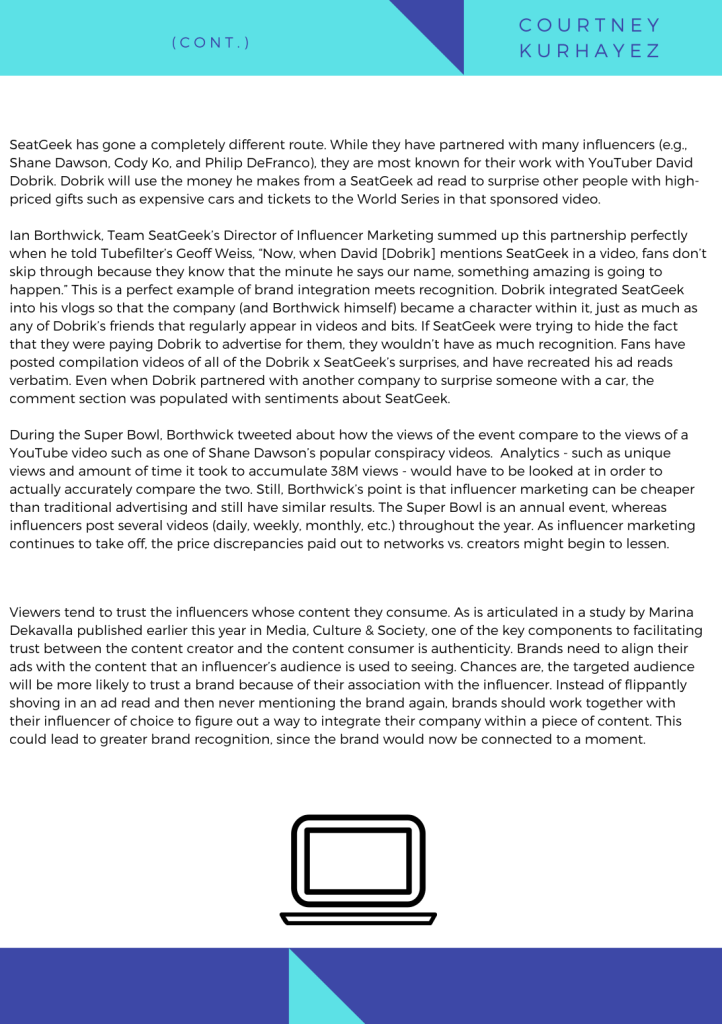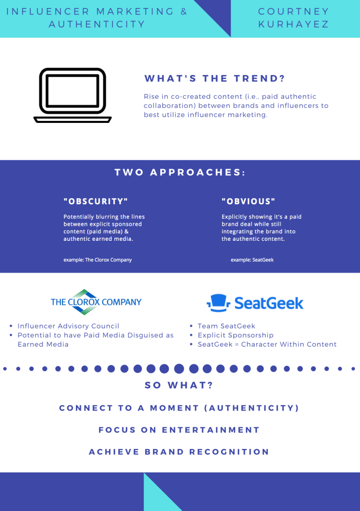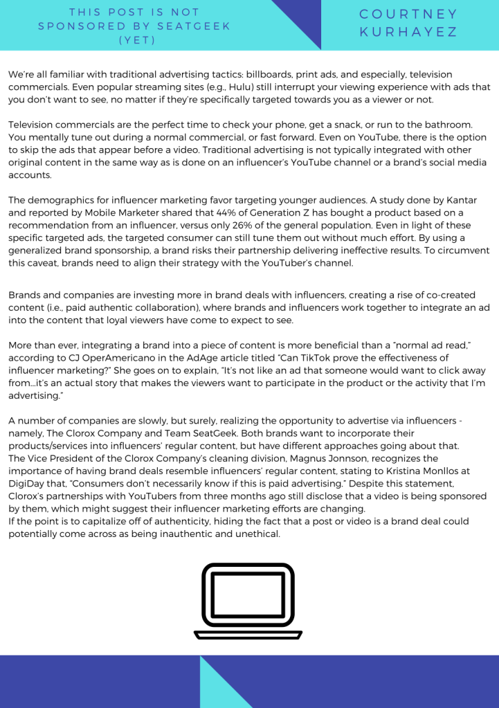 Before in-person classes ended for the Spring 2020 semester, I was tasked by Cardinal PR with spotting a trend for the upcoming year. The trend I chose to present on was the way in which influencer marketing and authenticity are evolving. I presented on the trend to the rest of my firm, which you can view on YouTube or watch below. All of the materials created are also available to view on my LinkedIn. Below you can also find the one-sheet that was passed out to those watching my presentation, as well as a more in-depth blog post writing sample on the topic. Both documents are available for download below, and the blog post is available to be read in its original form here.